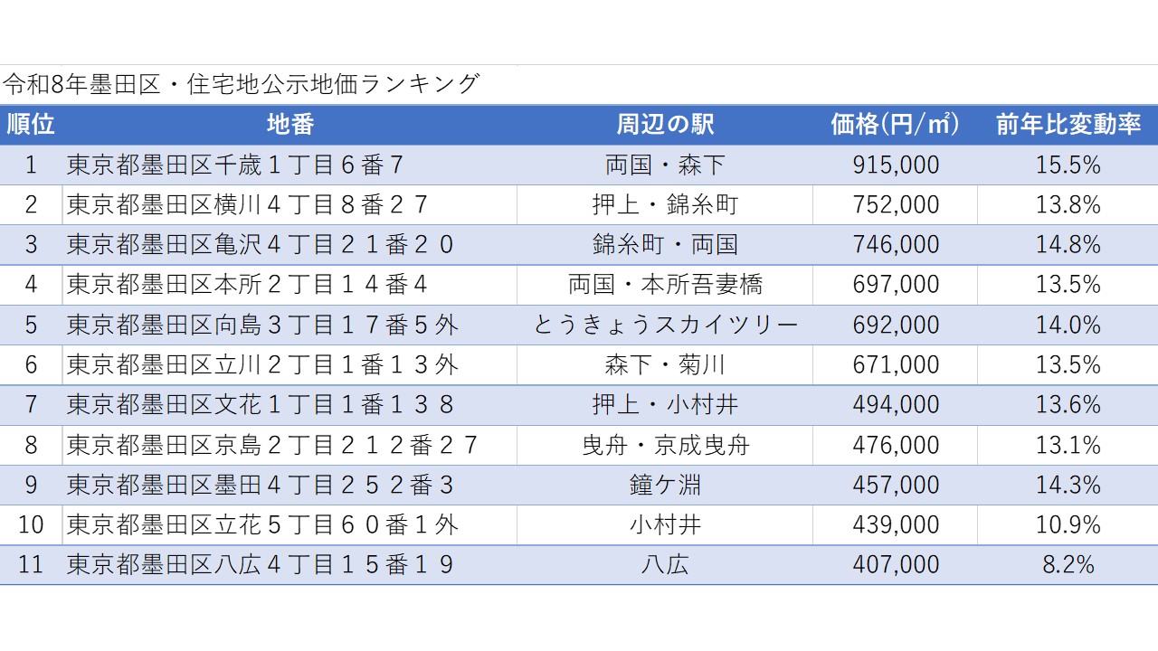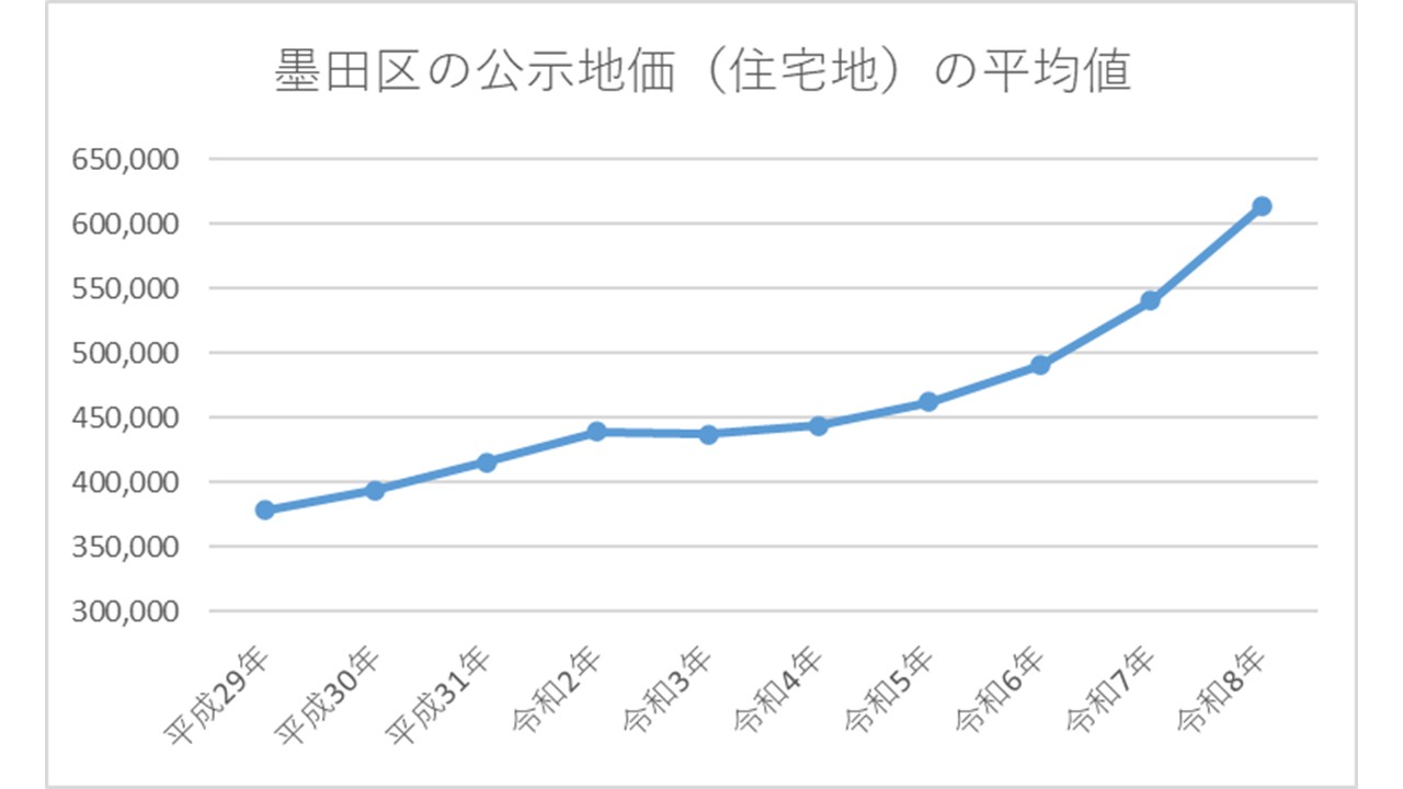令和8年の墨田区の住宅地公示地価は、前年比+13.5%と大きく上昇し、都内でも際立った伸びを示しました。